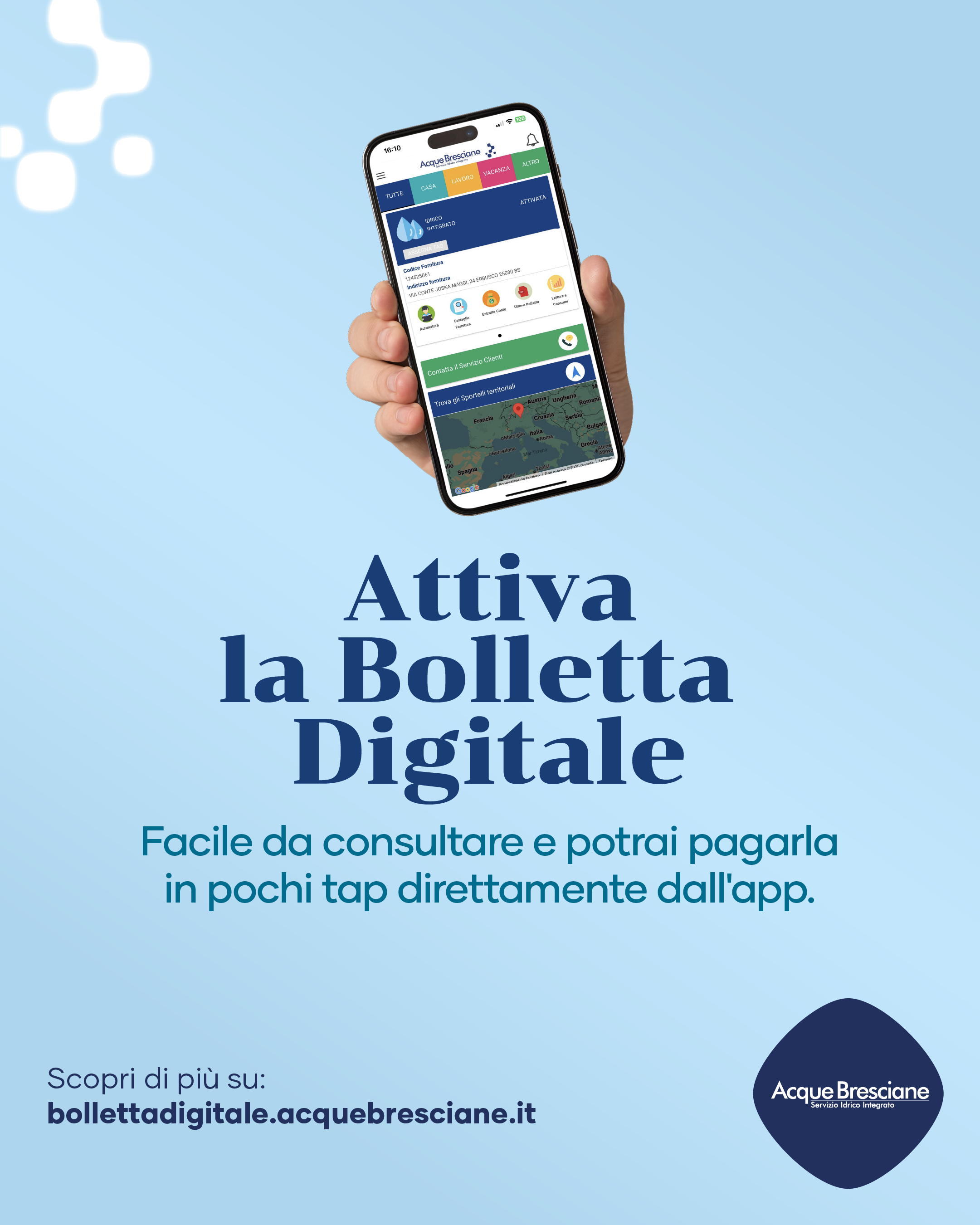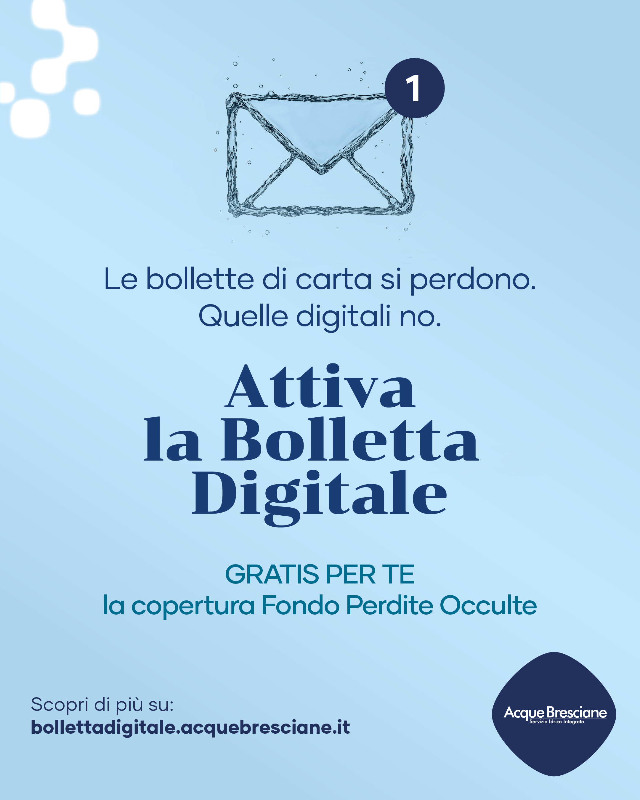 Da marzo 2025 Acque Bresciane ha avviato la campagna di informazione “Non c’è Acqua da perdere”, finalizzata a incentivare il passaggio dalla bolletta cartacea alla Bolletta Digitale, promuovendo al contempo una cultura orientata alla sostenibilità ambientale e all’efficienza del servizio.